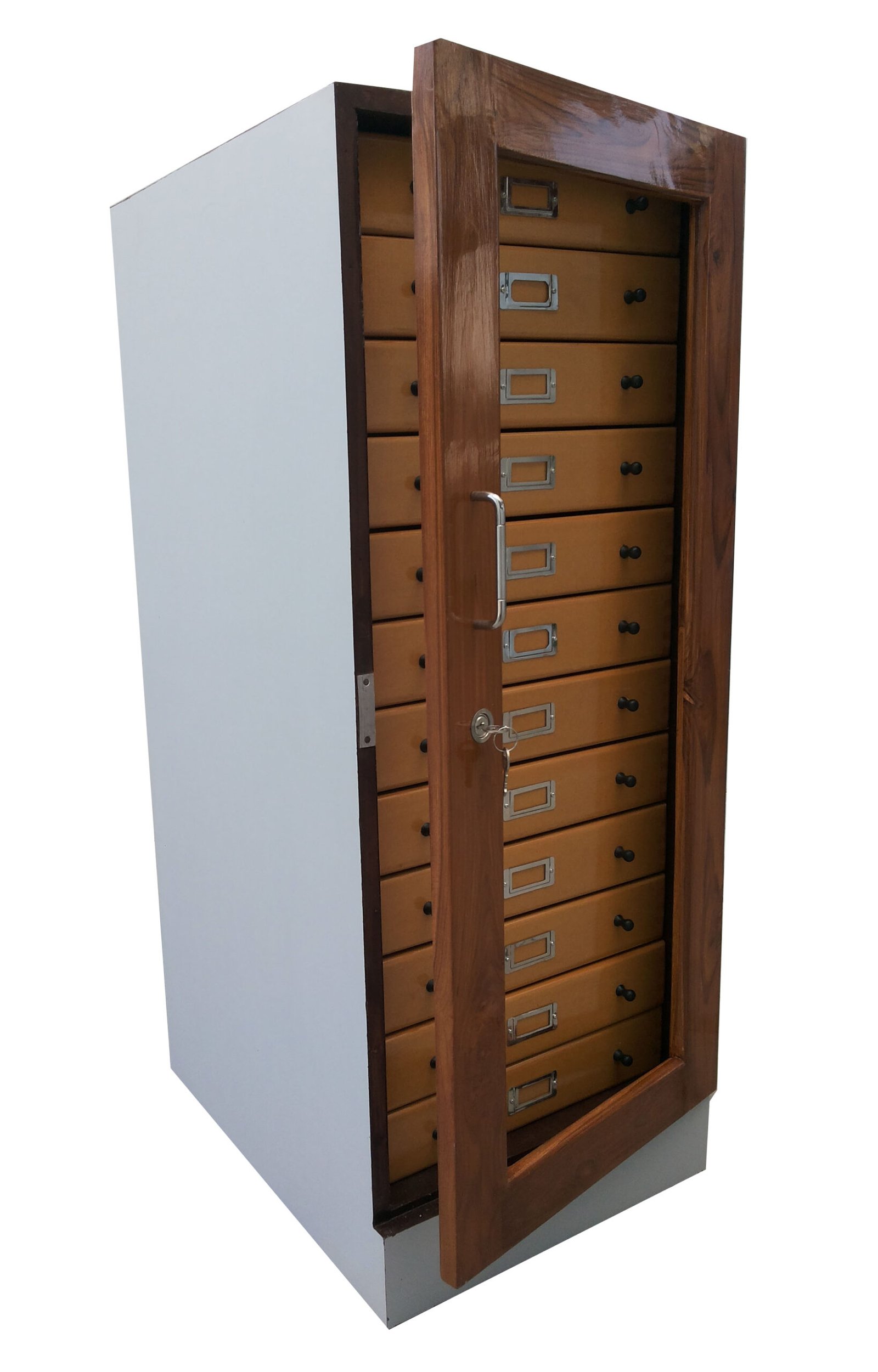 For keeping botanical specimens securely placed in herbarium sheets. Cabinet frame of 19 mm ply board finished with laminated sheet. Hinged MDF baton on collectively lock the drawers. Frame of MDF with plyboard bottom fitted with puller knobs and index card. Holder. Phosphorous bronze clip provided inside drawer for keeping herbarium sheets in position. Drawers finished in spirit polish. Drawers size :- 450mm x 370mm x 80mm